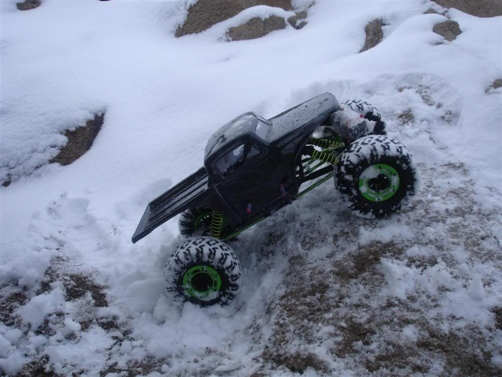 I was just using my stock Axial tires, but the guys with Mashers did well in the snow because the tread pattern sloughed the snow off pretty well.