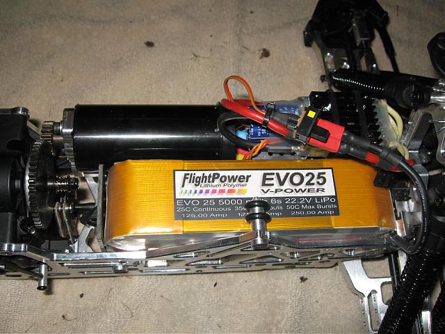 I made a barrier as discussed to stop the battery from hitting the spur during bashing. I used a dremel and cut it out of a piece of carbon board. I attached it to one of the posts supplied with the kit using zip ties and CA.