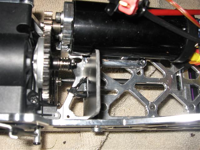 I made a barrier as discussed to stop the battery from hitting the spur during bashing. I used a dremel and cut it out of a piece of carbon board. I attached it to one of the posts supplied with the kit using zip ties and CA.