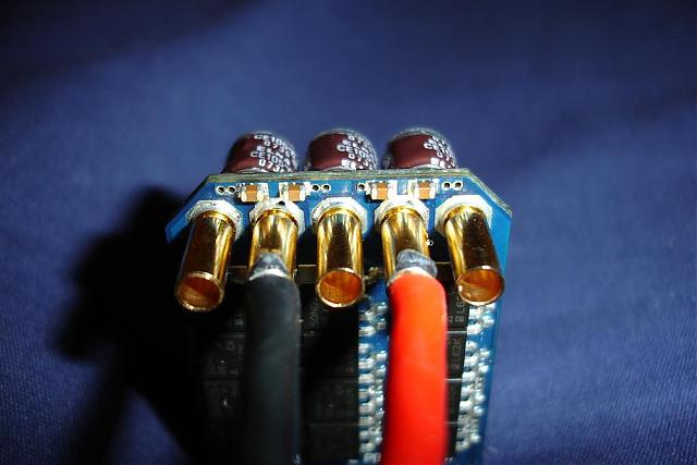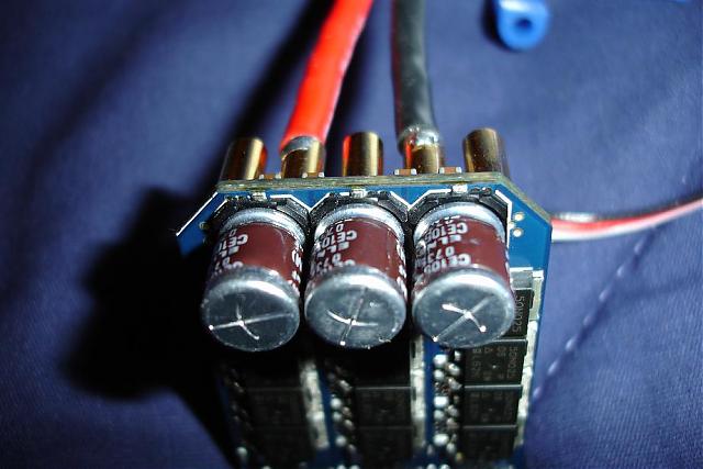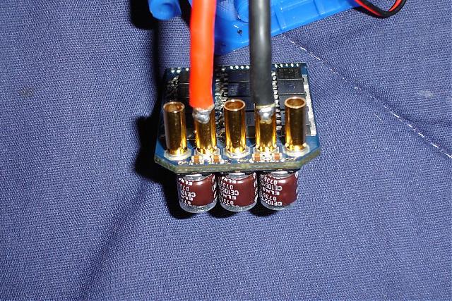 Came up with the idea the other day after I thought of running 5s through my VXL if disabaling the over voltage cutoff. Basically what the mod is, is I will take off the (weak) cold soldered 3.5mm female bullet connectors and replace them with direct solder Deans 12awg Ultra wire. Less resistance and less to worry about in terms of the darn cold soldered bullet connectors coming off of the board. I am also looking into replacing the capacitors with bigger 35v 330uf capacitors to handle the power input. Another thing that Im interested in doing is direct soldering a novak capacitor to the input leads on the TRX connector to reduce heat. Not sure which one to use though- http://www3.towerhobbies.com/cgi-bin...ovak+capacitor
