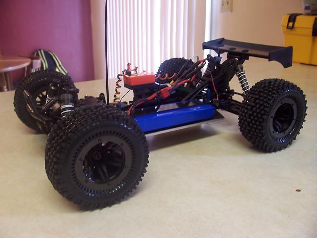 I am running 3s 3500mah lipos in it, on a 15t pinion geared for 45 (I know, a little high). I am also using the full sized crt origional wing (dyed black). I also made a custom rear body post.