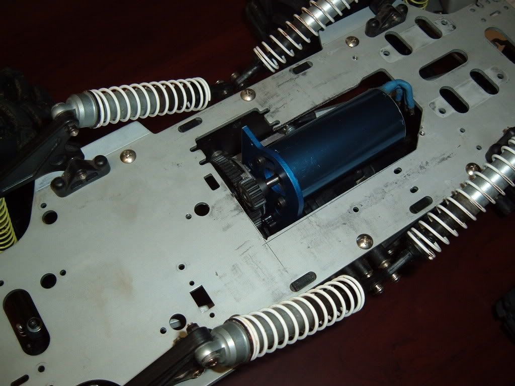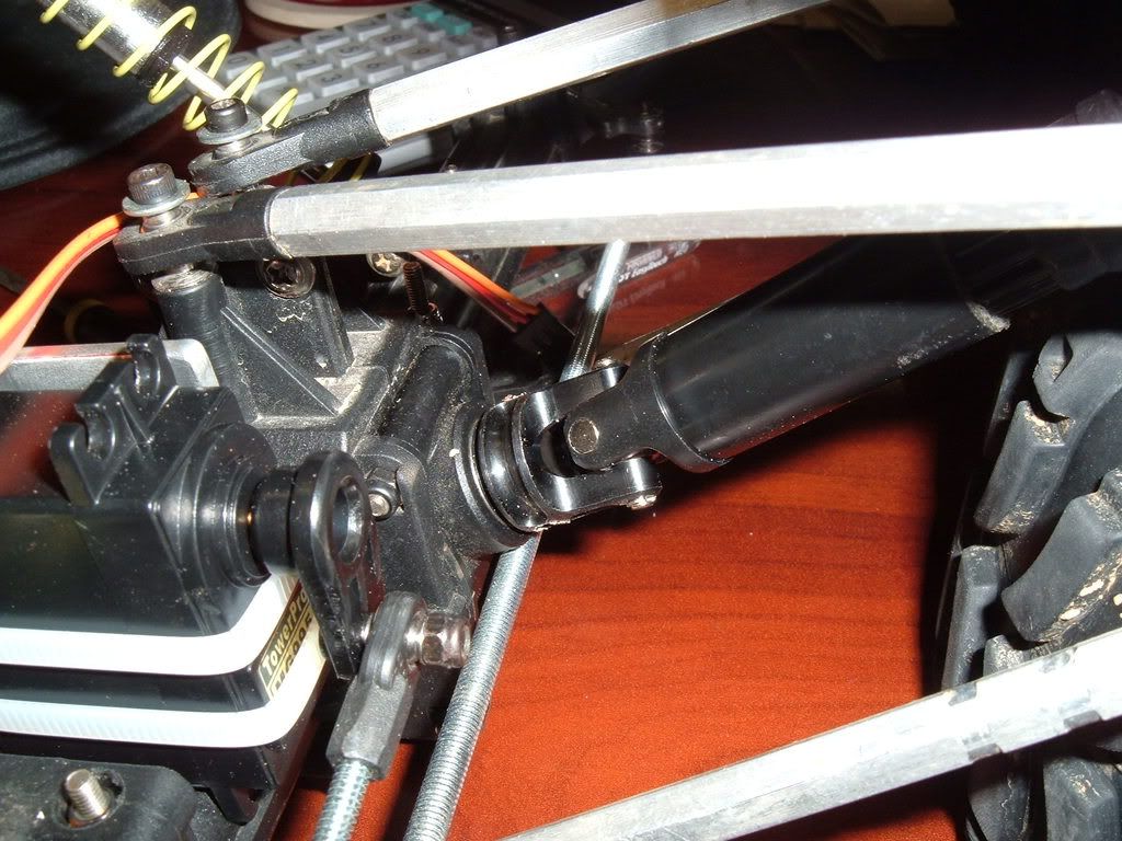 I also had to trim the chassis to fit the motor and tranny. Note the extra 4 shocks where the canteliver links used to be. This truck has alot of articultion, and no binding! I still need to make the linkages and servo mount for the rear steering, and wire it up.