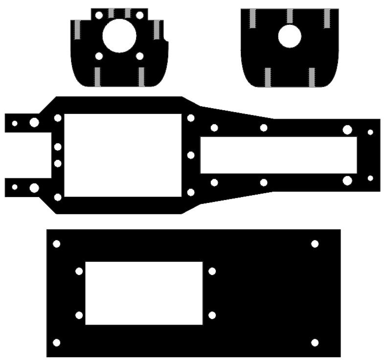 Top left is the motor mount, top right is the rear motor brace, middle is the upper chassis brace (ties the front shock mount to the rear shock mount), and bottom is the skidplate. Also, the cutout shown on the skidplate won't actually be a cutout, but where a 1/4" deep pocket will be milled out. The skidplate will be 1/2" thick black delrin.