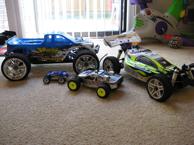 I sold stuff some recently, so that's why it's a little lite. The Muggy is converted to BL, the Hyper 7 is stripped of smelly nitro, and will get a conversion next year; the Mini T is my 3 year old son's, so it's stock, and the Micro T is mine. It's converted to BL/LiPo, but it is completely custom! The complete build can be found at: microtforumdotcom > mods & how to's > "730mah Lipo" It's worth a read.
