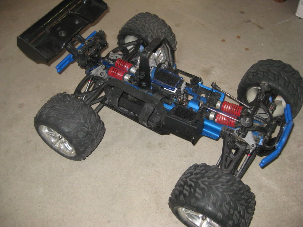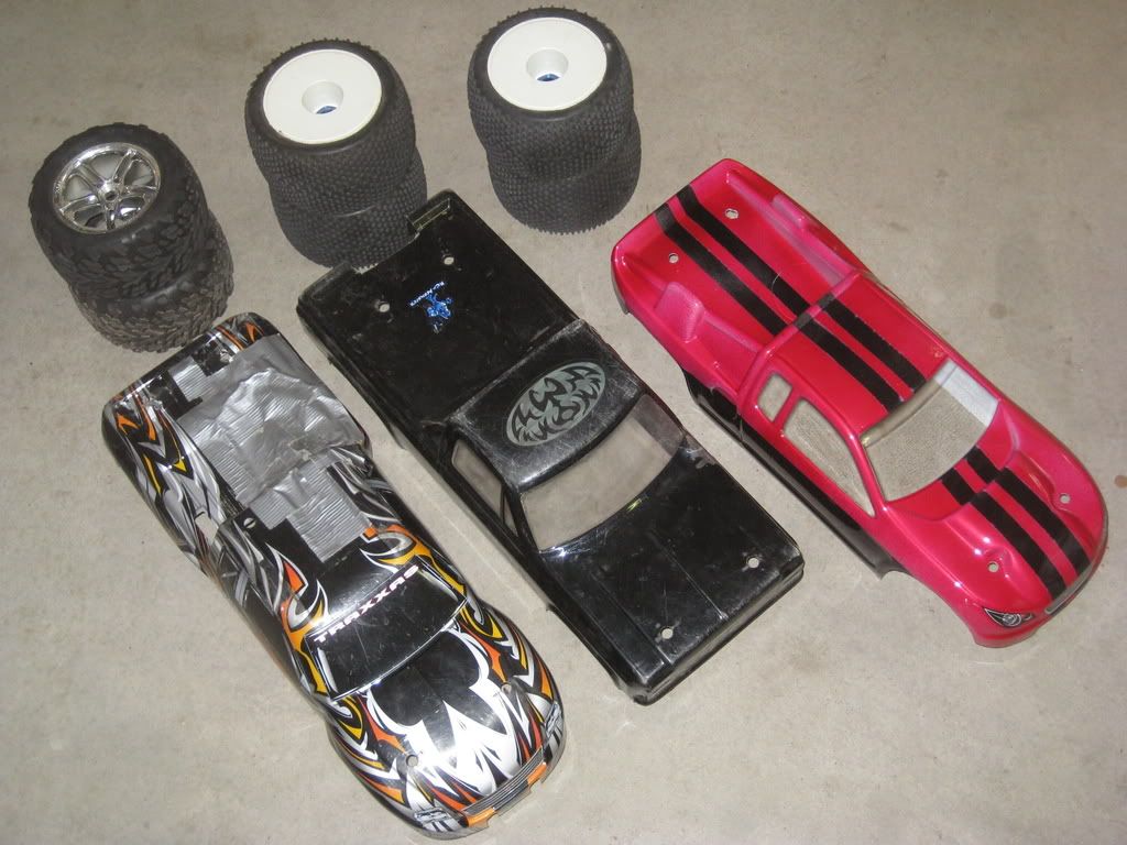 Also comes with 4 Pro-Line 40 series wheels with white rims and Bowtie tires on 23mm hex adapters. As well as the stock wheels, with one extra wheel (perfect condition) and another extra stock wheel with a stripped hex. Has brand new never used front and rear skid plates installed in it. The transmission is locked into 2nd gear and has the wide ratio gear set installed in it as well as the forward only conversion. The three bodies pictures are also included. One body has duct tape holding it together. I use it just to run on the street o keep debris out from the chassis. The pick up truck body has a crack, but can be fixed. I fixed it, but it cracked again. The last body is a Pro-Line crowd pleaser and is brand new, never run, and recently painted.