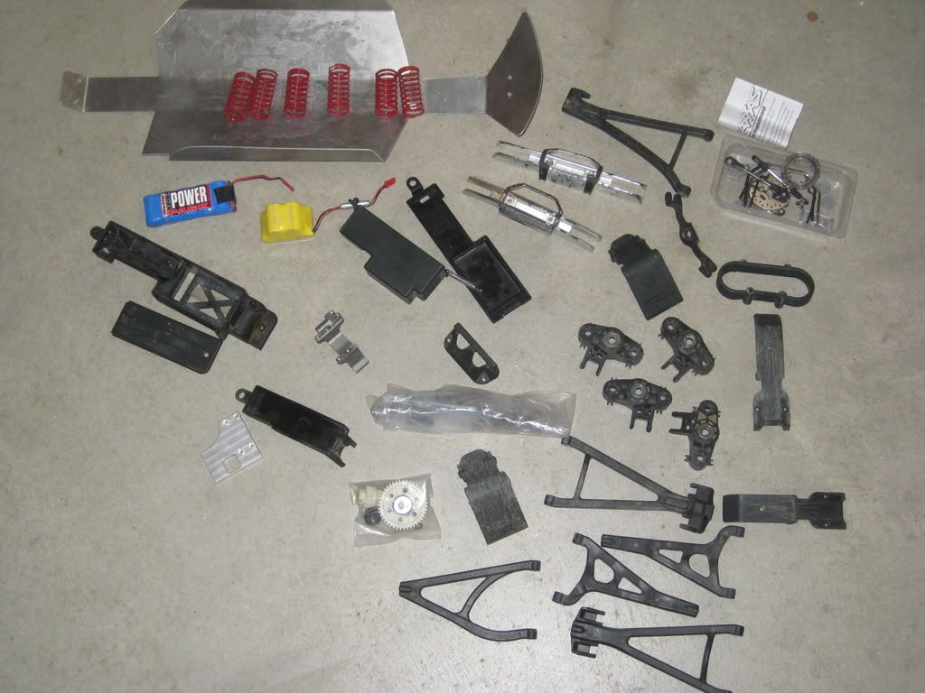 Aluminum chassis, all stock a-arms, hub carriers, bumpers, receiver boxes, receiver packs, spare mounts, stuff to install disk brakes back on it. Almost all spare parts work, but some stuff may not work like some of the small stuff, but not sure. Also some spare different tooth spur gears are included.