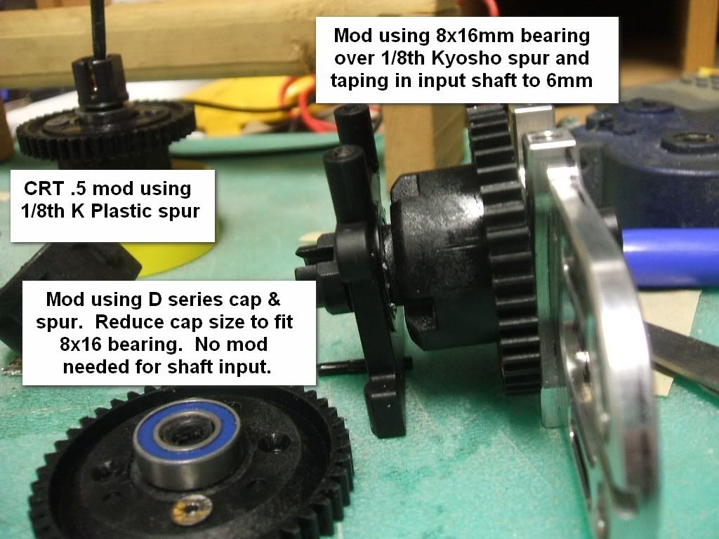 The only problem with this option is just as you see above buying the crt .5 center differential and spur and mounts. For me personally, I would like to keep the Kyosho center differential setup with the plastic spur. I don't care too much for the metal to metal gear mesh.
