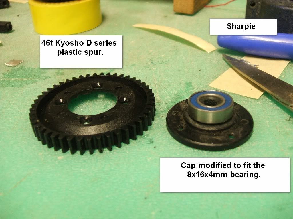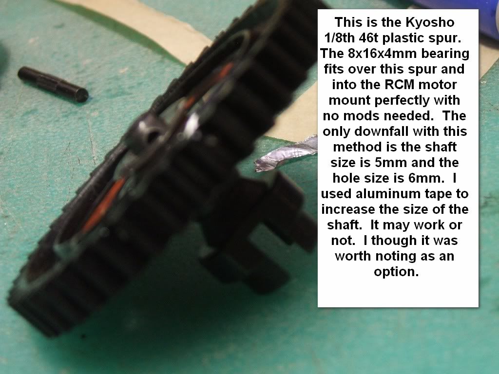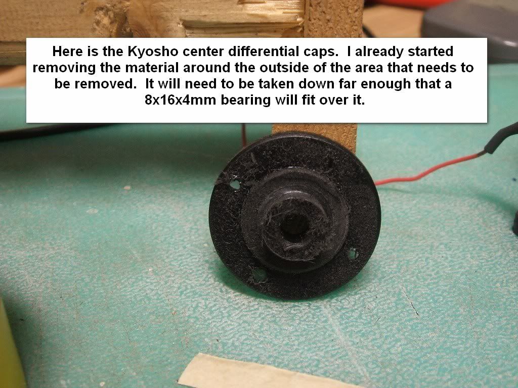 2. To find a bearing that would work with the RCM mount and the Kyosho center differential would need to be 12x16x4mm. This would be the easiest if they could be found. I had no luck finding any bearings of that size.