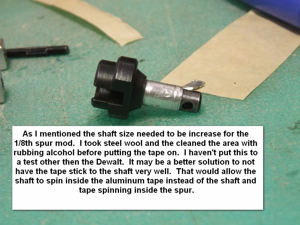 Here's what I've come up with. The mod to the existing cap and spur will work the best due to the 1/8th spur has a center hole of 6mm and the shaft on the axle drive is 5mm.
