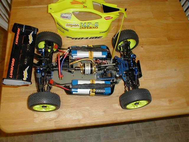 The motor is 600kv. It weighs 7.75 lbs. I've yet to test it. It should do 40-45 mph and run (I hope) 15 min. The mount was made by Monster Mike. I tried getting some shots of the mount, but they didn't come out so well. It's set up 6s A123. The outrunner is a Rimfire 42-60-600. The car is a Kyosho MP-6. I call it an EMP-6. The motor mount is secured to the stationary end of the motor with 4 screws. It bolts down to the front 2 mount holes of the center diff. It is secured by the top brace that runs from the top of the mount to the steering assembly brace. It came out very well. Mike's work-mount,brace,rear dog bone and design are superb! Don