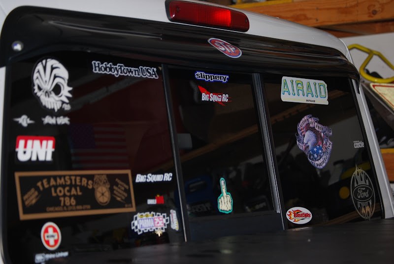 This is the back of my dad's Ford Ranger. He always wants at least one sticker from any R/C sticker sheet I have. How many can you spot? Can you tell what brand they are? And sorry about that blurry side, I think it was bad lighting but it is still pretty read-able.