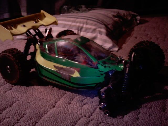 Well, i finally get the hyper running, and it was amazing. i took it down to the ramps down the street and was havin lots of fun crossing from ramp to ramp. Whoever made the ramps keeps making more, and i found a brand new one there today. A 5 ft kicker ramp. So I launch my hyper off of it, and it topped out around 12-16 ft in the air before i landed perfectly on the downramp! Unfortunatley, that was the end of my fun. Later I think the pinion is loose, but it is not. there is a chunk the width of the spur gear where the pinion was eaten down to nothing! So it was time to call it quits, and so I just shifted the pinion so I could drive it home and not carry it. On my way out, i deside to hit one last ramp... but the hyper said no, and i should have listened... Mid-air off the ramp, the front right wheel flew off, and now I cant find it! Im going to look some more tomorrow, but if that doesnt work, does anybody have a spare stock losi 8ight 2.0 rim with a fake bandland (fagland) tire on it?