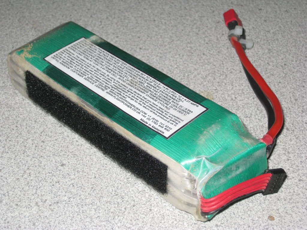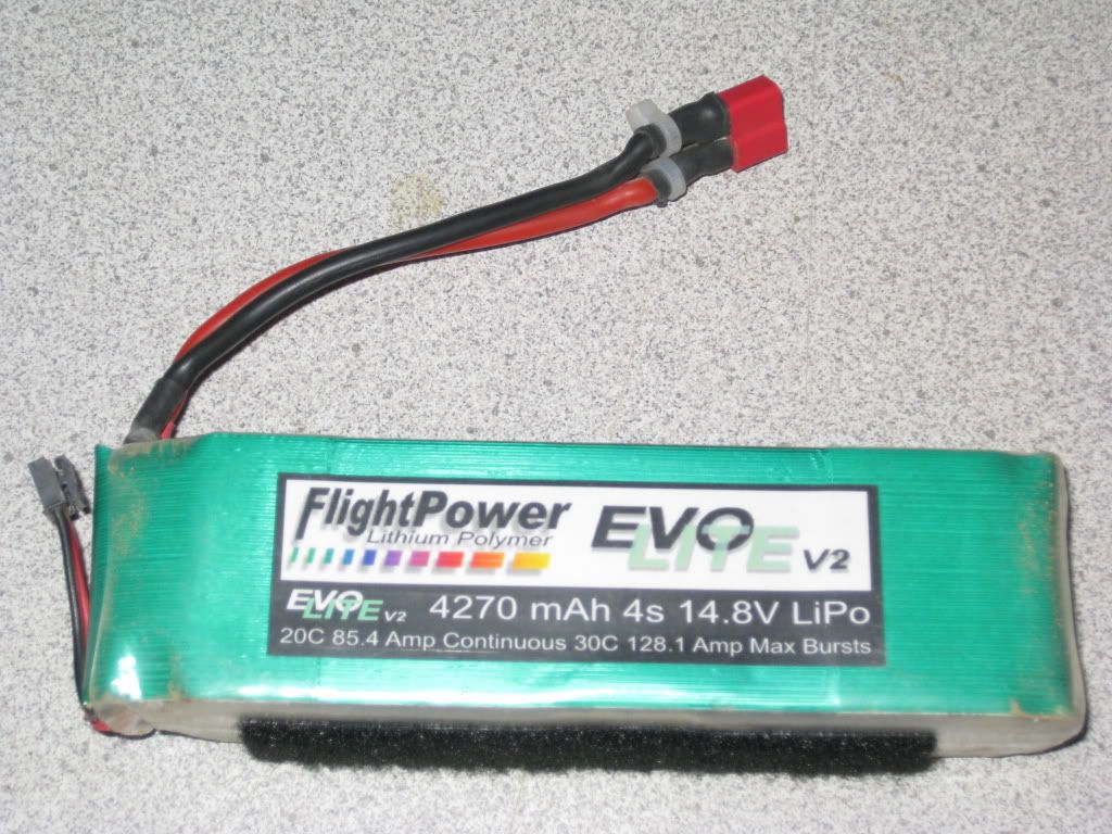 I also have a Flightpower 4s 4270mah lipo pack. It weighs 390g and the dimensions of it are 149 x 46 x 30mm. It has an 18C continuous discharge rate and 28C burst. I ran it in my CRT.5 and it never would heat up. No tears on the shrink wrap, just a couple slight scratches. It will come with deans plugs as well.