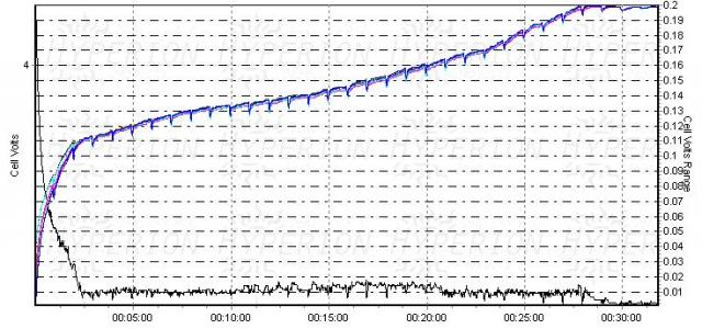 Now the discharge characterestics, same result, the bad cells have large voltage drop under only 3.2A discharge current. the good cells(red/yellowgreen/light blue) have smoooooth curve(low voltage change when current varies) and are very close from each other, while the bad group are full of glithes and far apart front the good.