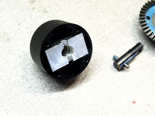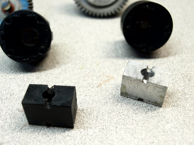 To make Lockers for the diff and the new Losi muggy center Diff I cut a piece of aluminum and Delrin to fit inside the carriers which ties the left/right outputs to the ring gear