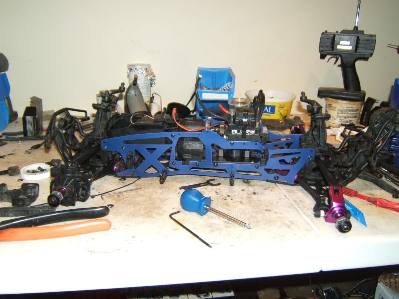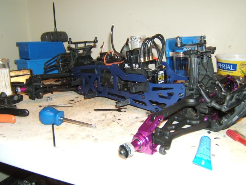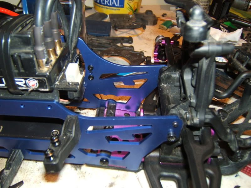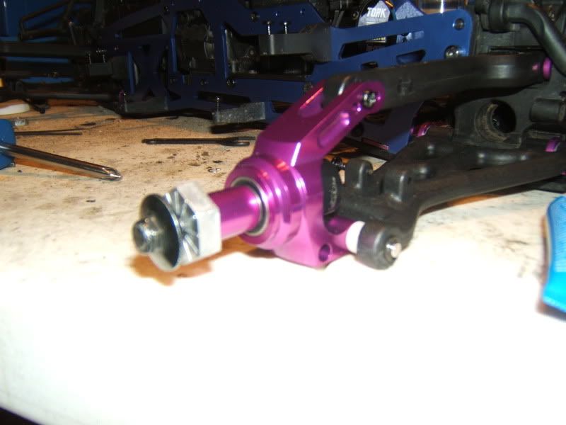 Well I got the TVP's on finally and picked up some of the integy alum. bearing carriers. Unfortunatly all they had were the purple ones *puke* but I am just going to have to deal with it haha. Also got bored and painted the PS, had a bit of a paint mishap thus the rc-monster and castle stickers on the bottom of it. Still waiting to get my diffs in the mail(starting to get angry on that one!) and also shock oil for the shocks then they can go on, plus ordered castle bullet connectors to switch everything over from deans.