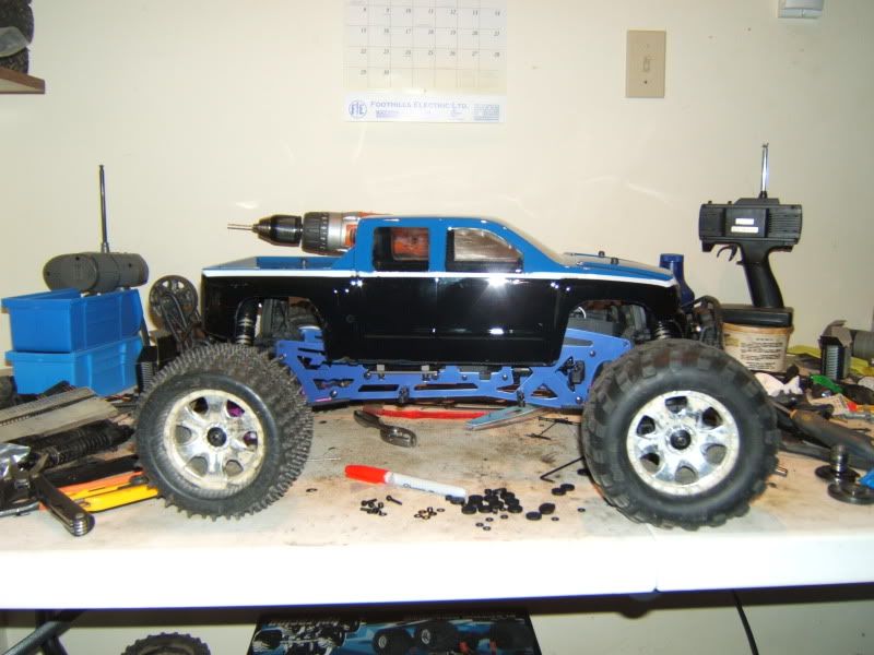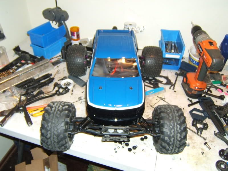 Got a body on (painted it myself, screwed it up and just not happy with it, having someone paint a new one) and the shocks also installed, along with switched everything from deans to CC bullet connectors. I threw on the stock wheels just to get an idea and HOLY this thing is huge!