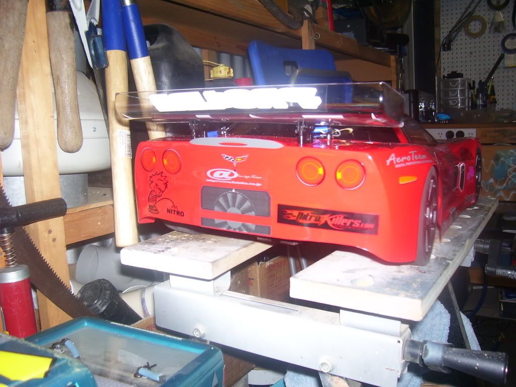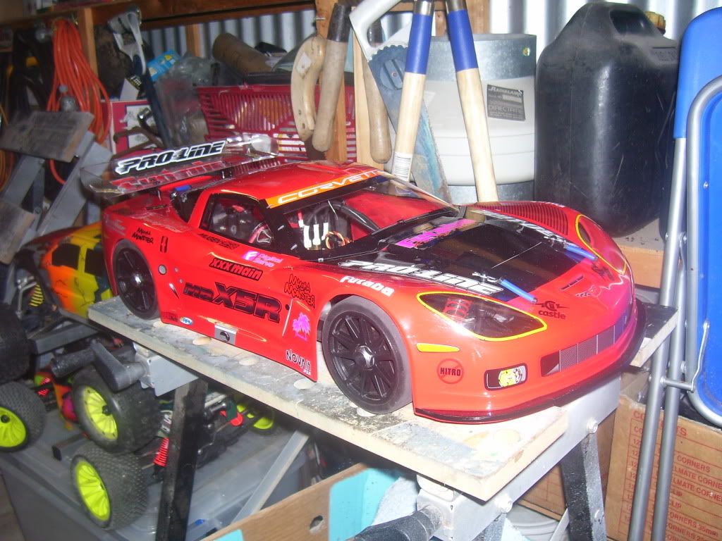 Well here it is......I converted my buggy to a onroad weapon,It started life as a Mugen MBX5R buggy with all the cnc and carbon fibre fruit ,I than fabricated a new extended chassis for it so I could fit the new Kyosho GT2 Corvette body.I also fabricated the servo mounts ,motor mount,esc mount and made a custom front toe plate to fit the bumper ,the rear cvd was taken from a Hot Bodies D8T truggy and the front cvd is a standard rear MBX5 cvd.The wheels and tyres are just no brand onroads from the US,The esc is a Monster Mamba V3 and the motor is a Tekin R8 2650kv,It is set-up for 6s lipo with 2 3s 30c 5200mah in series, But have found that this is just way to much power for the wheels to deal with so I have now set it up for 4s (2s 35c 6500mah in series).Ran it today and was very pleased with the top speed and am still able to do controlled drifts with it.Hope to have a vid of it real soon ,just have to find some free time.