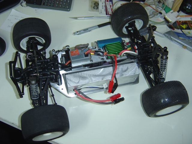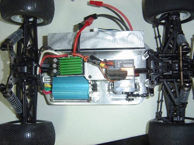 I used some aluminum angle and delrin blocks to make the battery tray. It fits a maxamps 2s6000. I didn't like the idea of the battery hanging off the side of the chassis, so it's on it's side. I also made room for the RX and ESC on the diff top plate.