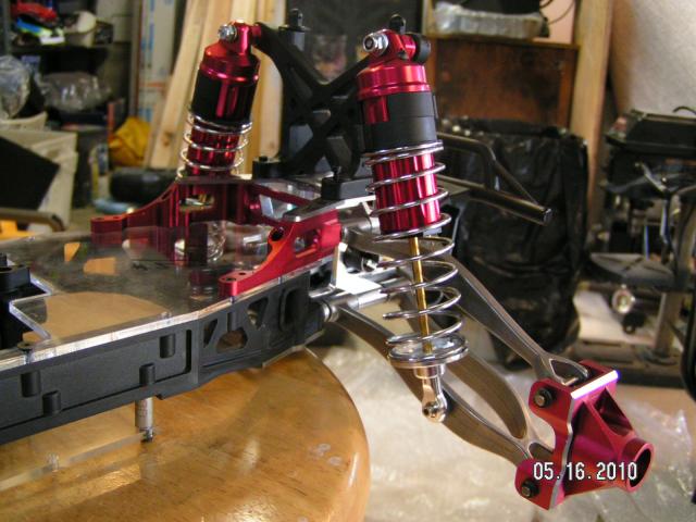 First I had to finish up the front end and get some shocks put together for the rear (still waiting on a pair of Ti shafts for the front). I had originally purchased Dynamite Red bodied shocks, then changed my mind and bought a set of Losi threaded hard anodized ones. Only issue at first was that I would have to get the shock ring re-anodized red to match the truck. I was going to use the red caps off the Dynamites, and hopefully end up with a decent looking shock. Well, the cap wouldn't thread on to the Losi's. I then tried the stock blue caps, and they threaded onto both shock bodies fine, and the red caps threaded onto the stock blue bodies.....don't have a clue what could be happening here, but it's fairly obvious I'm not going to be able to use the hard anodized ones.