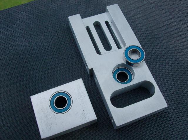 This one was started the end of 2009, and was originally going to be a twin inline outrunner chassis. I ended up deciding against that for numerous reasons. Simplicity was still a design priority however, so that meant it would not have a transmission. But being a pure basher, and not a racer, a center diff was not that appealing to me. I briefly considered a belt drive, specifically SDP-SI's new Conidrive series, but the available ratios would not have been easy to design around (driven pulley diameter and belt length). My next choice was Mod 1 gears, and the LST2's 63T spur fit the bill. Enough diameter to the keep the stress radius to a minimum. And keep it plastic hopefully, knowing I could switch to steel if needed. So my next move was drawing up the motor mount, which is a stressed member in this case. It is made of 1/2" aluminum, and I knew I wanted a centerdrive with an 8mm shaft. Having 1/2" to play with I went ahead and used two 8x16 bearings, where one would have been more than adequate.