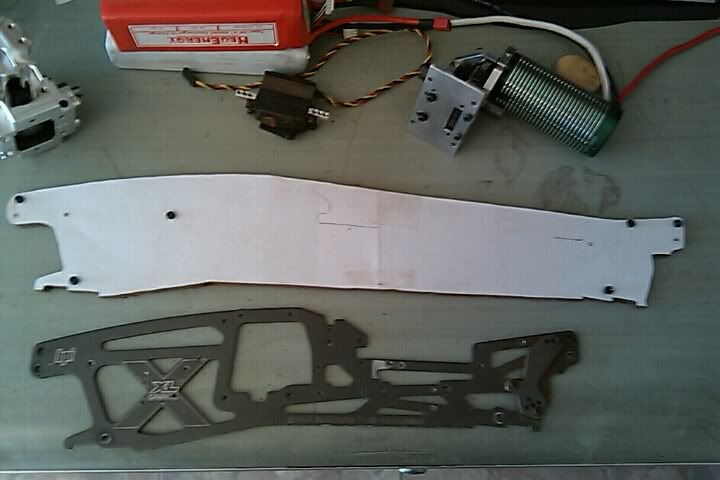 Anyway, I chopped up an old alu skid plate I had from an emaxx way back when. I wanted to build a little platform to mount the RCM UCD and the slipperential to start test fitting and getting an idea of how I want to do the ext tvps. One big trick will be to be able to fit the rear servo in there with the motor. The rear str rack requires a bit of room, and the servo has to mount high if its along the rail to allow for proper travel. I want to move the motor way back to hopefully have room in the center for batts. Getting everything inside the TVPS is going to be a pita.