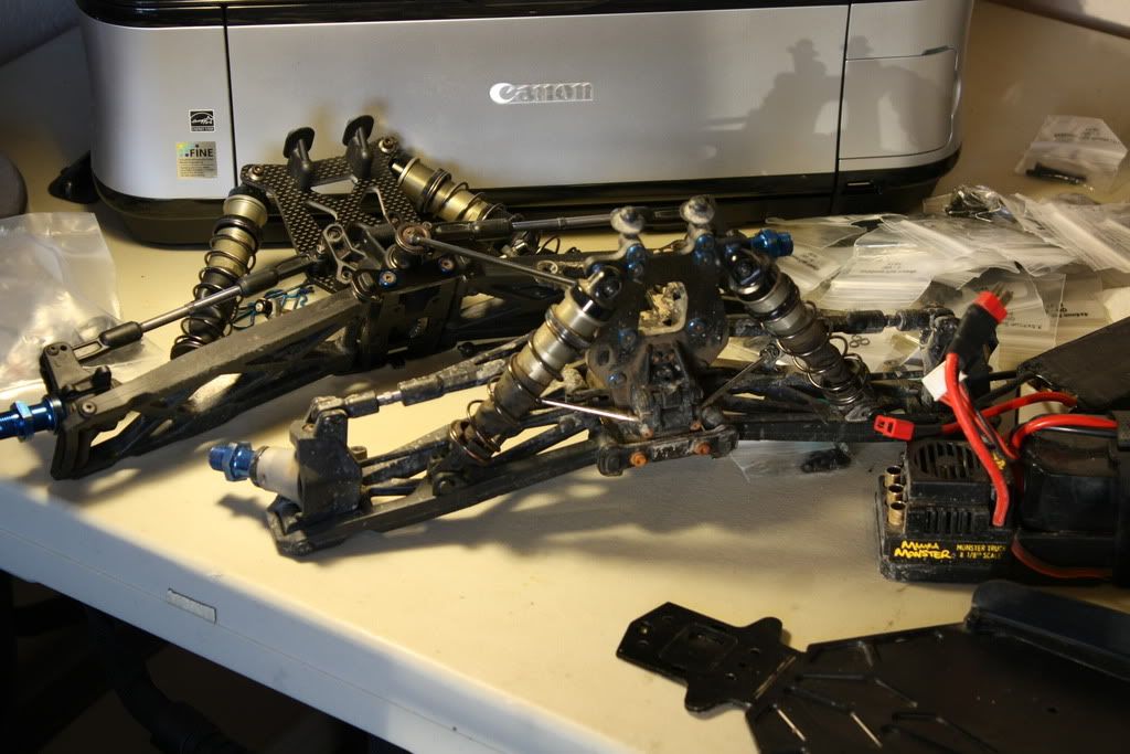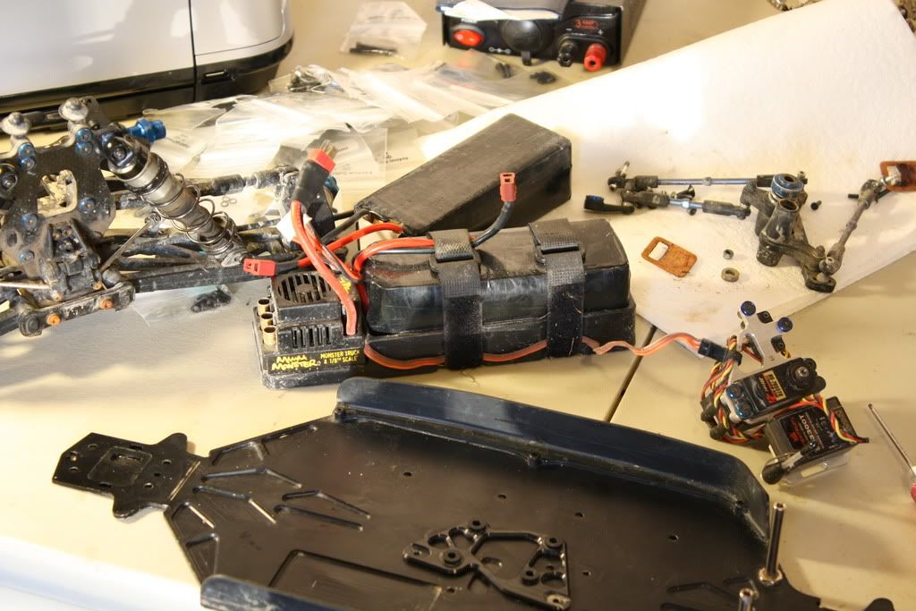 To the side I have a complete screw kit and a bunch of spare parts. Buyer of the chassis will also receive some assorted shock and diff oils, replacement bearings, and some other stuff.