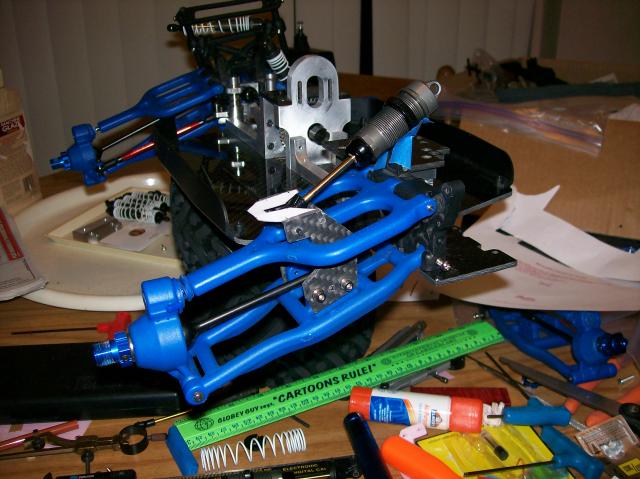 Revo style, I like but wouldnt really work for my appplication. I decided to go with an 8 shock ofna set-up. I think there a larger bore size than even the U.E. shocks, which does anyone know the bore size on those? I also have coming my G.A. bulkheads coming. So once i get shocks and bulkheads in hand Im going to start working on shock towers.