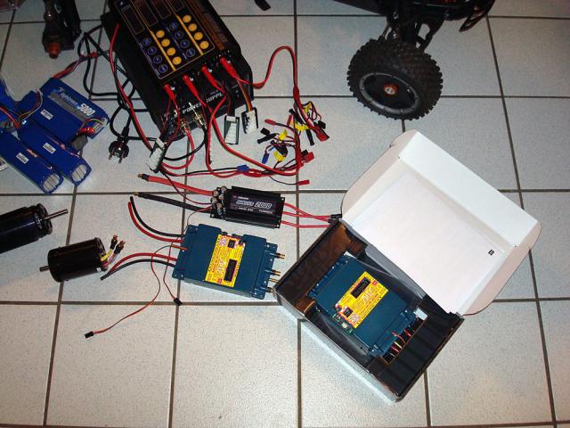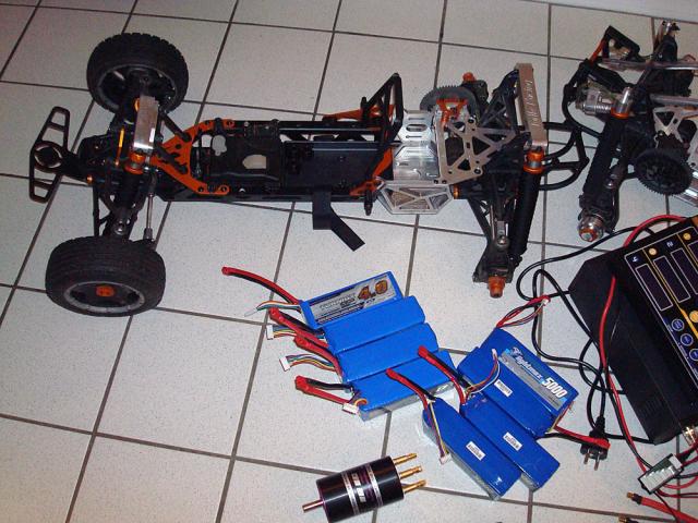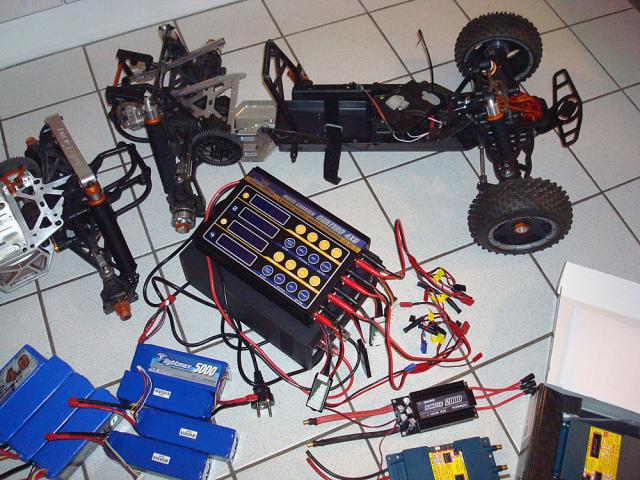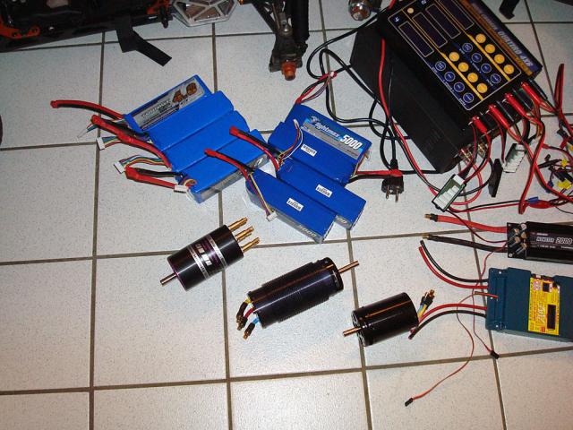 it's been a while since there has been any activity here. I just wanted to let you know that I am by no means stuck with my two brushless bajas. A lot of time has passed with waiting for the Castle large scale ESC but I took the decision to go with the Schulze ESC's when they announced that the 12S version was further delayed. Anyway, here you have a few pics with all the parts. The Turnigy ESC is just put in there for fun - it burst into smoke and sparks after 3 minutes of use... Not all parts are in the pics but most major parts are there. The cars are partly disassembled.