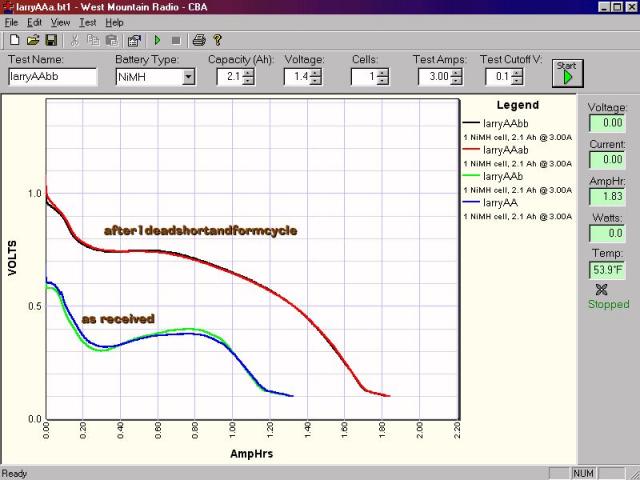 It's too bad I didn't save more graphs , but here is two such AA cells that were given to me to "fix". A graph before and after just one deadshort and formation cycle. This is as good as it ever will get. Unfortunately I do not have any pics of subsequent "cycles"