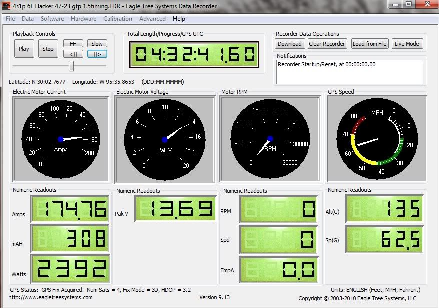 Was testing my 1/8 speed runner with some new ESC tweaks. During acceleration pulled ~174A@3.4V per cell, which is around 35C. This was my oldest 40C 4s1p 5000mah hardcase pack. Pack warmed up quick after that stunt. Car had a blow over around 70mph after hitting something and I called it quits for the nite. Side note, Tekin 222 firmware didn't work for me.