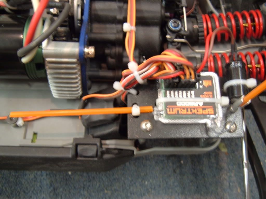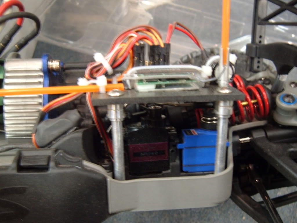 Made an elevated tray to hold the receiver. Use a few diff posts from a hyper7, and a scrap piece of kydex. Also found an antenna holder from a tamiya something or other. The bec is double stuck to the battery vent. You can also see my esc signal wire routing, kinda funny but I wanted to make sure it did not get cought in the outrunner rotating can.