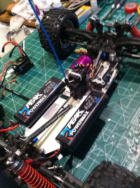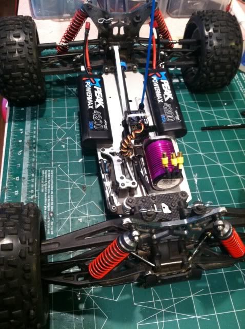 I've had the truggy for a little while, I bought it as a kit and converted it right away to electric. I ran it for quite some time with a hacker 16xl on 5s lipo, it was great until I blew the rotor apart (wasnt wrapped in kevlar or any material, the magnets just came off. so I pulled the motor out and have been running it with my hacker 13L, which is about 1800kv while the 16xl was 1200kv. The big difference is the length of the can and the torque at low end. The 13L on 4s powered my a mamba monster cogged a lot! So, I am now running a mamba max pro and its much better, deffinetly keeping that esc in there but I am in the market for a new motor. Thinking either tekin T8 or team epic D8 maybe team orion MR8L, all the motors I'm looking at are 1900-2000kv to run on 4s. Anyways, On to the pics and how it sits