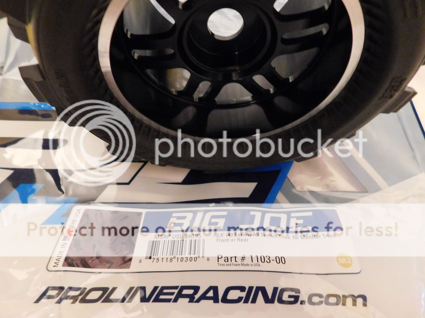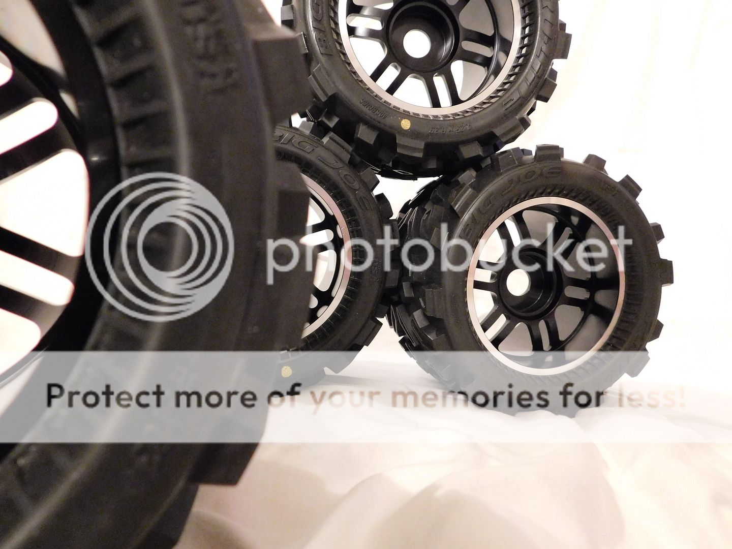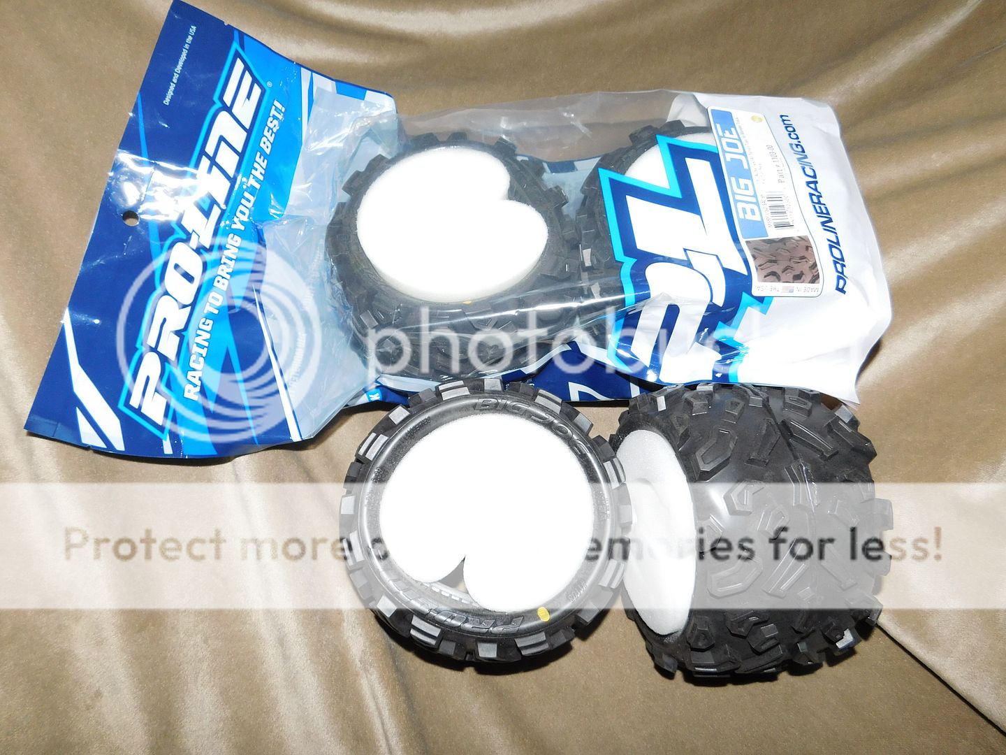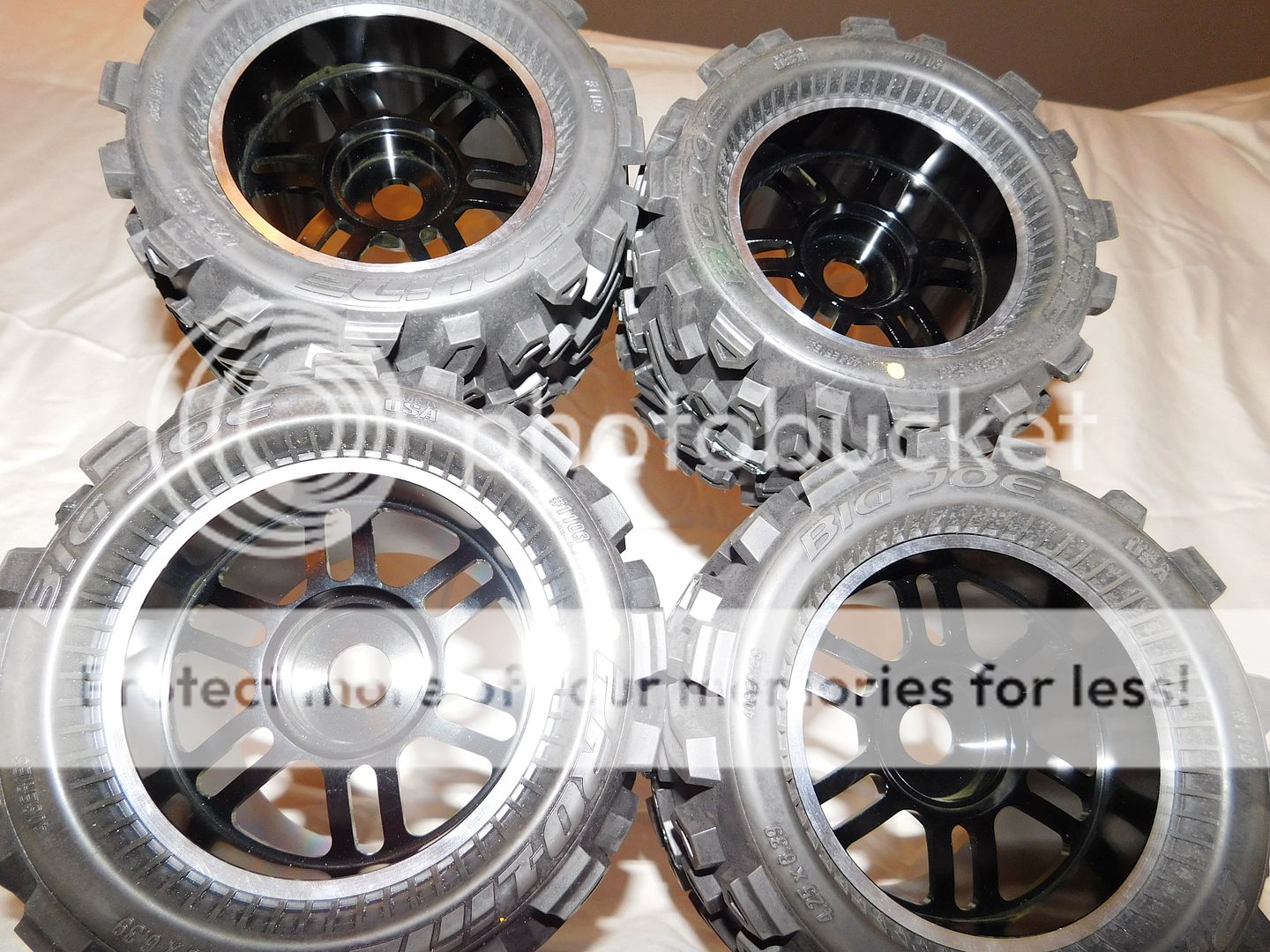 As a teaser here are the truck's newest shoes. Billet ALUMINUM 40 Series 23mm hub wheels, 40 Series Big Joes, and 40 Series Bowties. I found solid 23mm hexes that mount like regular truggy 17mm hexes. They mount unlike those wretched Proline 23mm hexes. I also have some VTR Calibers that I need to clean up. They are truggy tires. They are what I use most. I don't think that they weigh half of what these Big Joes weigh.