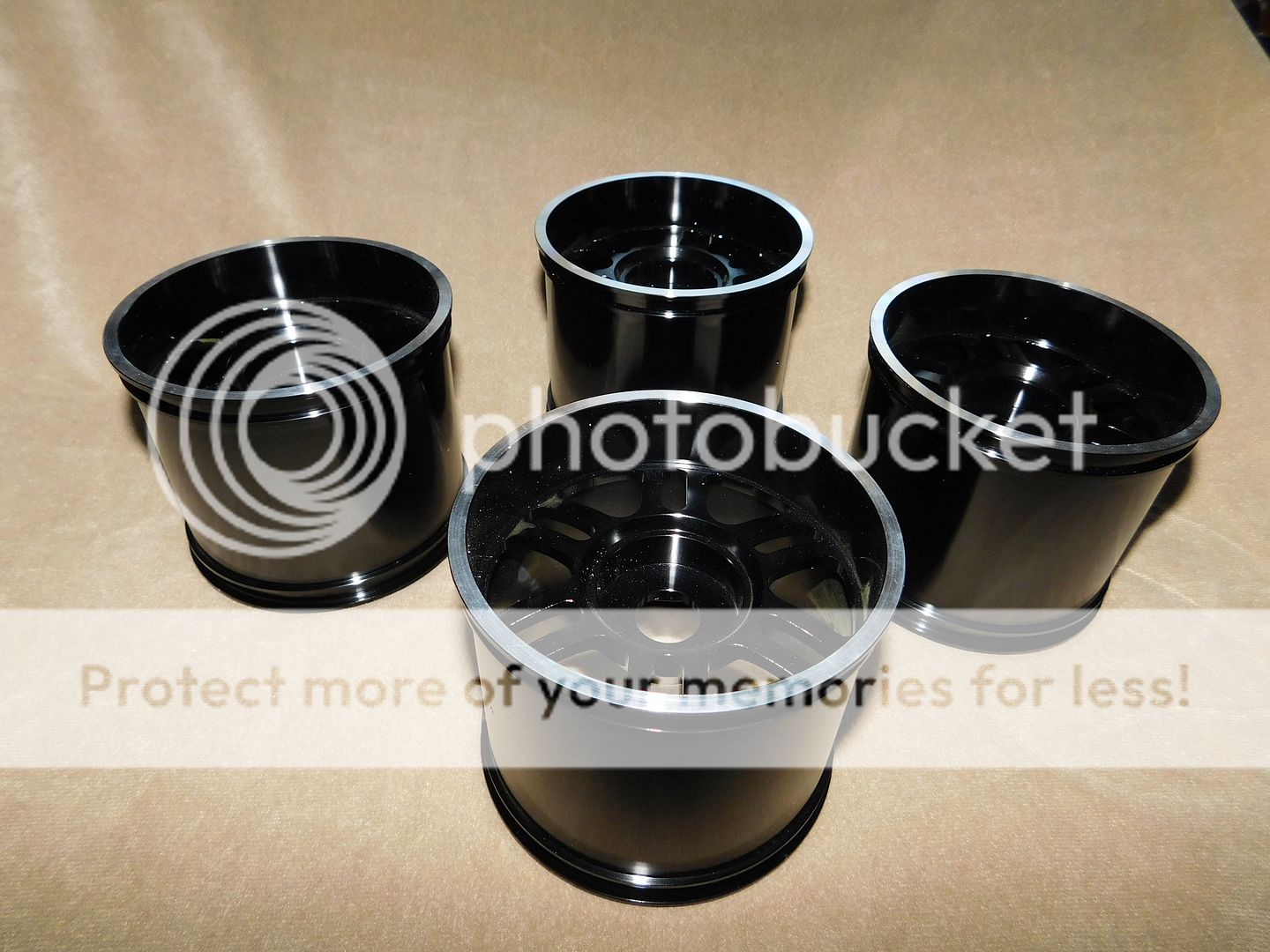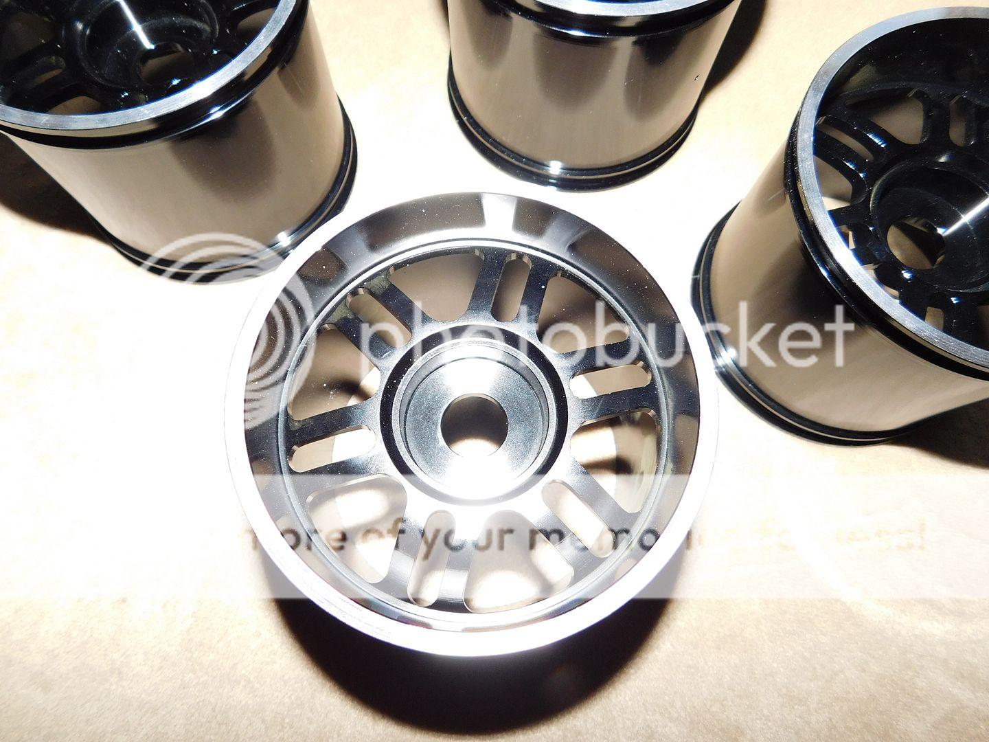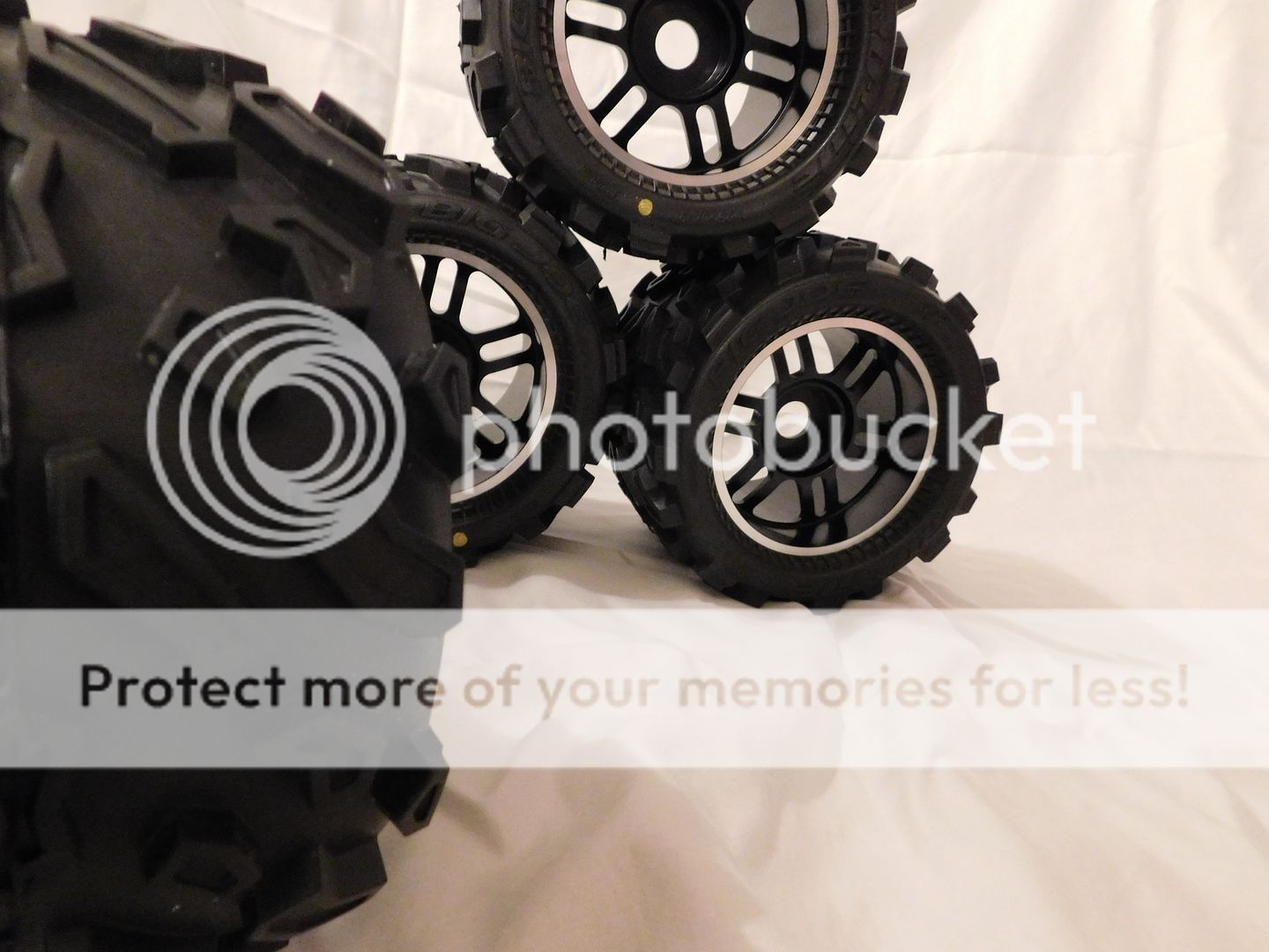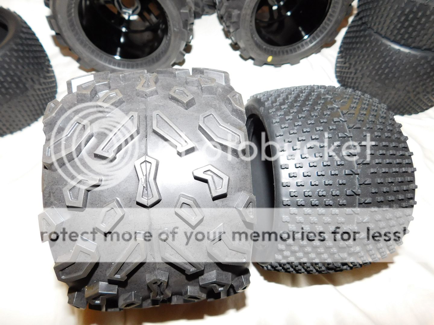 As a teaser here are the truck's newest shoes. Billet ALUMINUM 40 Series 23mm hub wheels, 40 Series Big Joes, and 40 Series Bowties. I found solid 23mm hexes that mount like regular truggy 17mm hexes. They mount unlike those wretched Proline 23mm hexes. I also have some VTR Calibers that I need to clean up. They are truggy tires. They are what I use most. I don't think that they weigh half of what these Big Joes weigh.