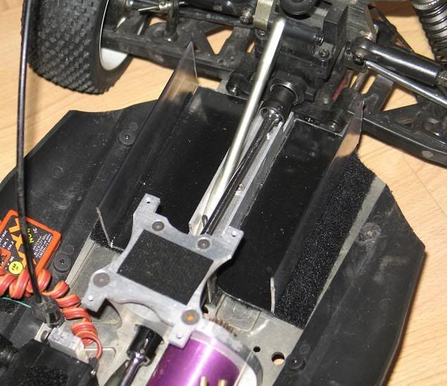 I suppose I could try out new mudguards, but finding them wouldn't work too well. The LHS I work at (only close one) only stocks one 1/8 buggy: the XTM XT2. While I could try out the mud guards from that, I just don't think it would be worth it. With the Maxamps batteries I plan on getting, they will easily sit neatly on the chassis, and what's good about that is that they will remain closer to the centerline (as close to it as they possibly could). Here's a pic to show why I can't mount batteries on the stock mud guards:
