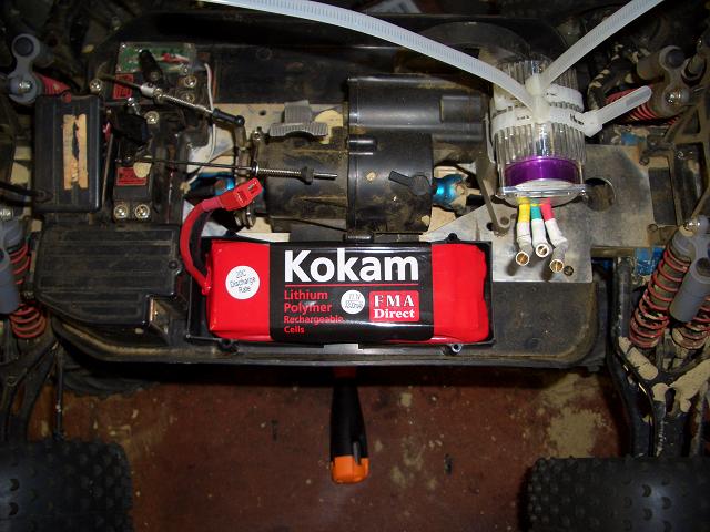 I first ran it on six GP3300 (the pack you see in the pics) to make sure I had everything set up right, then switched to one 8-cell IB3600 pack. With 6 cells it moved at about 10-15 MPH, I'd say. with the 8-cell pack, I'm sure it was over 20, but not by much. At the end of the 8-cell 3600 pack (10 minutes or so) the MGM 12012 was 115F and the Feigao 8L was 120F.