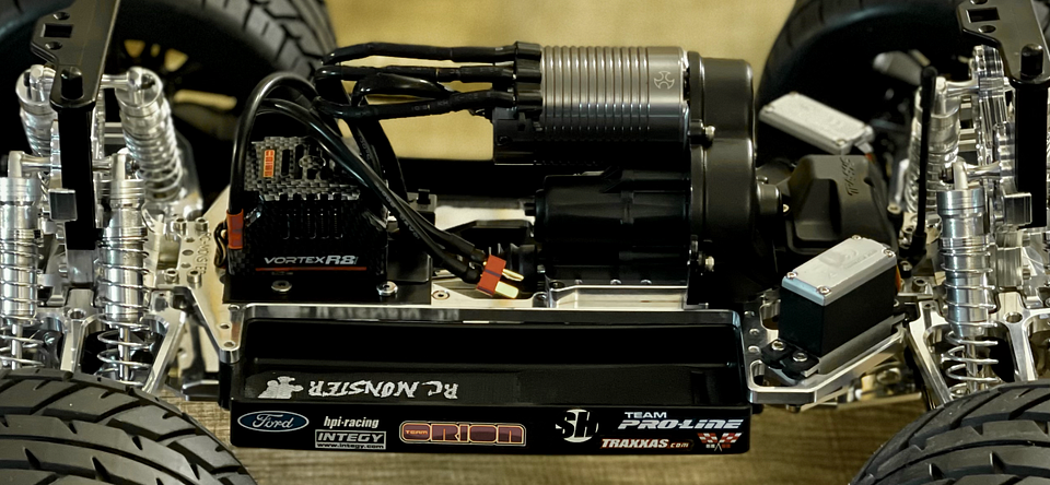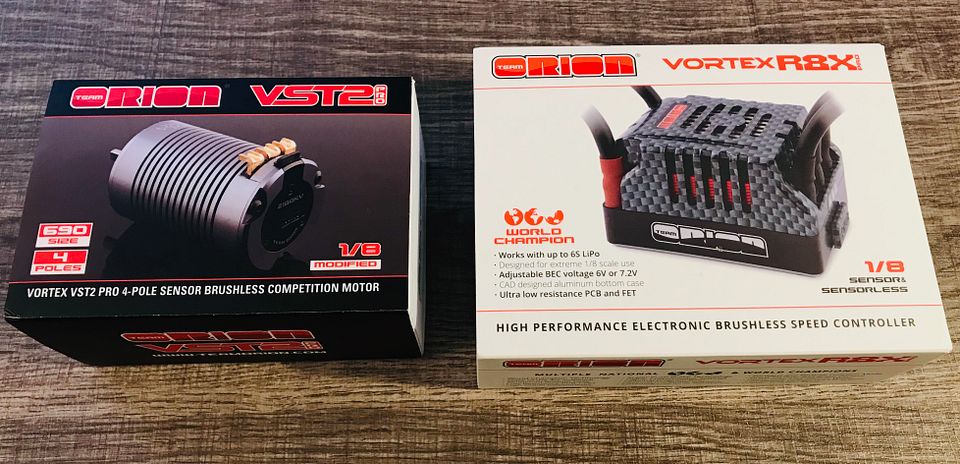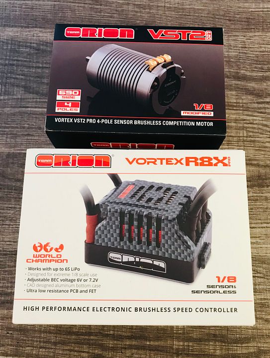 1). Team Orion 690 2100KV Sensored 1/8 Scale Brushless Motor and two Vortex R8X Pro and R8 Pro ESC's (220A, 2-6S) that's in two builds.