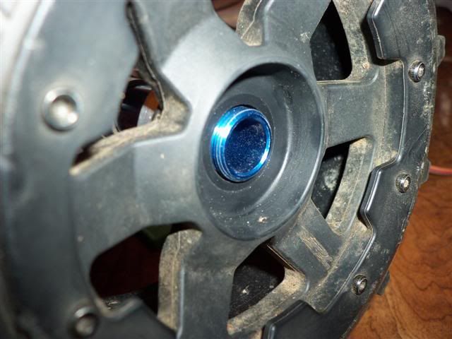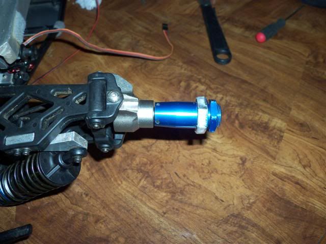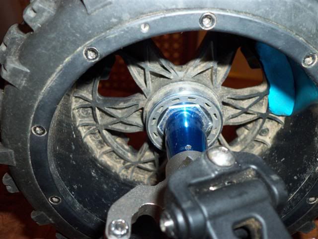 I've been rebuilding the back end, so just replaced the extended hexes with new ones. Since they extend beyond the axle, I can use a large 5mm bolt to hold the axle pin in place instead of fooling around with grub screws. It will look like this after the hex is put on: