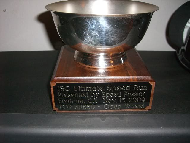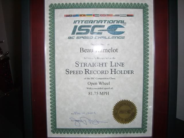 I won the open wheel class and also hold the current ISC world record. Not to mention probably the fastest e-maxx based truck ever! I am sure the truck could of gone faster but equipment failure because of extreme gearing. Traction issues when I rolled into the throttle the tires broke loose and the truck pulled hard to the right side causing me to correct all the way down the track were my limiting factors. I actually needed more test time to get it dialed in and I am sure I would of broke a 100mph. Overall I did win and I am very happy about that. I want to thank all of you that supported me in this venture :cheers: . Heres some pics.