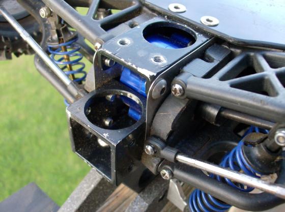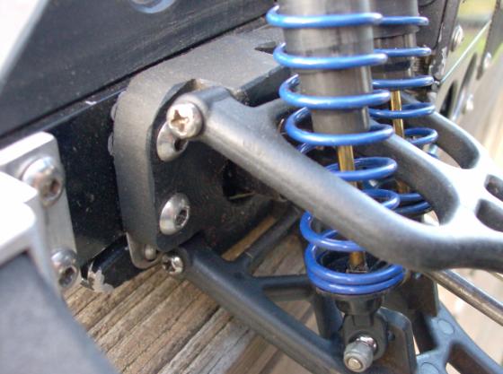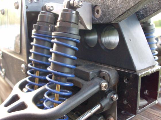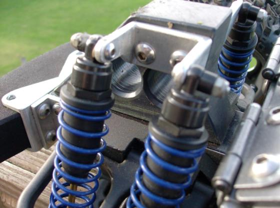 The new shock mount pieces (alum) are temporary, as are the wing and wing mounts. Just 'proving" parts before I settle on material. I had to make new 'T' sleeves for the bigbores because the Trinity spings are FAT and were almost going over the stock T washers, those are delrin.
