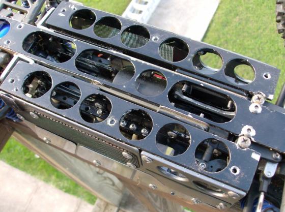 The steering layout was a tough one, and not very pretty. I remade the draglink from .132" stainless, also the lower tie-in bracket is .075" SS. There's stainless scattered throughout, the motor mount is also .132" SS, the 'windows' are .030 mirrored SS, and there is .012 sandwiched between the center backbone and the outrigger channel (battery cradles) to provide alignment for the round diff output moldings, and for assembly. Also for simplicity I only used 3 fastener sizes, M3, SAE 6-32 and SAE 10-32, all stainless. The skidplate is another unknown plastic, it's waxy, and very easy to work with, and the front bumper is for a Nitro 4Tec, and is also temporary. Originally I had used 1/4" smoked lexan that was actually cut out of a Pioneer bandpass sub box lol. And all of the other material was free ;)