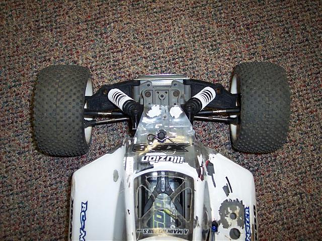 I palyed with my setup earlier and lowered the front shocks a bit. Seems like it could use shorter springs, to decrease the ride height a bit. Otherwise it looks like a good setup. I need to order the wing mount and scare up a body, as the ofna mbx body I have looks kinda funky!