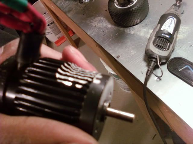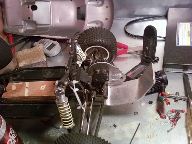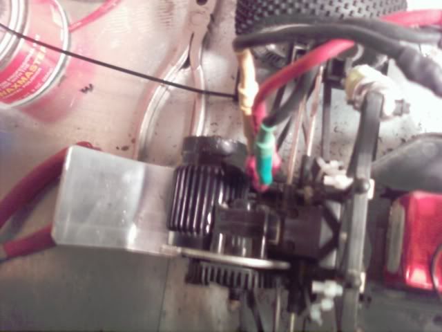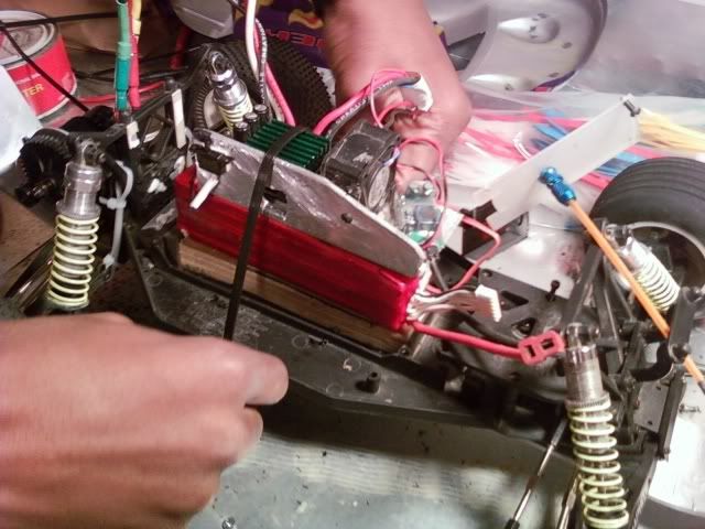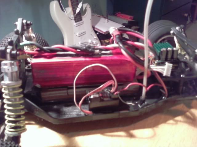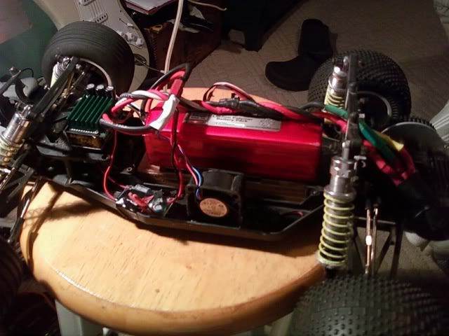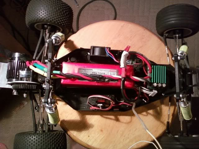 So i was at ben's house today, and besides the bash from hell returning to haunt me, we decided to work on my supervader, and we finally got it running! It was a pain and a half, but thanks to the heated garage, we finally managed to get it running last minute before I had to go home. we had to extend the motor mount slots, mod the slipper to house a mod1 spur gear, shave down the plastic housing of the transmission, and then carve off some of the fins of my 8L and finally it all fit! by that point i got the call that my dad was on his way, so we just rushed, put the lipo on, and then took the entire sharkfin from the hyper 7 and placed it ontop of the lipo, plugged in ben's dsm rx and let it dangle, then ziptied the whole thing together, and ran it on a nearly dead 5S lipo. it was amazingly fast!