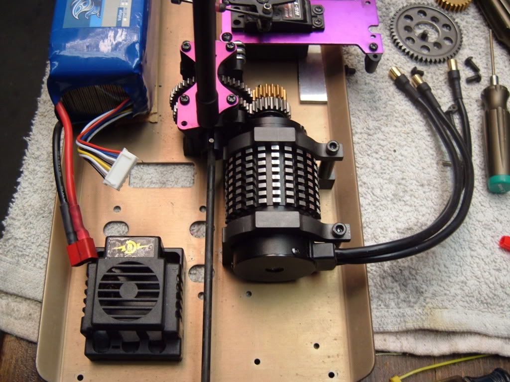 Plus the front and rear chassis braces will mount thru it, and it will stiffen the center of the chassis, and help keep the gears mesh correctly. The gear mesh will be set with the center drive and the motor mounted to the plate off the vehicle and then the whole assy will be mounted in. I could cut some "windows" in the stock chassis, kinda like a nitro chassis, just depends.