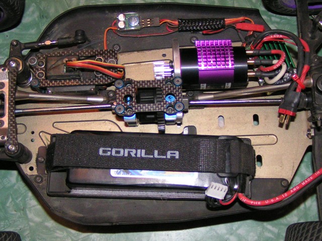 Bruce, I didn't like having the MM on the chassis either. I took some 1/2" aluminum rod and cut them about 1.75" long (or whatever works for you) and then drilled and tapped 5mm holes on one end and 4mm holes on the other. I used the 5mm holes to mount the rods to two of the existing motor mount holes. I then cut a 1/8" thick piece of aluminum plate that would accommodate the MM and punch two holes into it and screwed the plate to the rods and then used some good servo tape to stick the MM to the plate. it all looked like this...