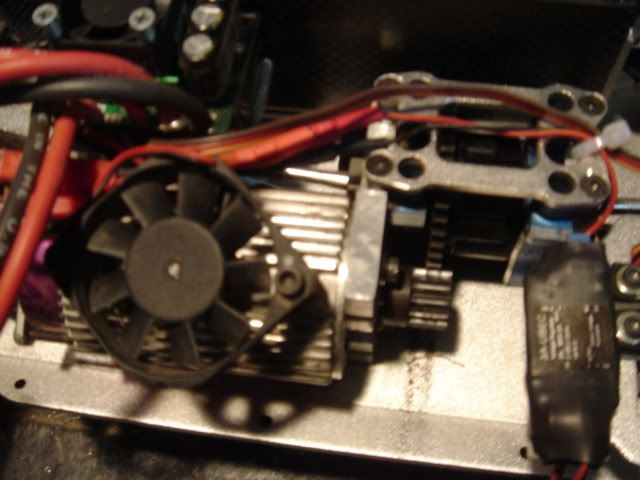 I got the 12v fan from radio shack and run it off of the 4S pack. I use a small 12v regulator, also from radio shack, when I run more than 4S. I just drilled and tapped the heatsink for 3mm screws. There's more than enough meat there for the threads.