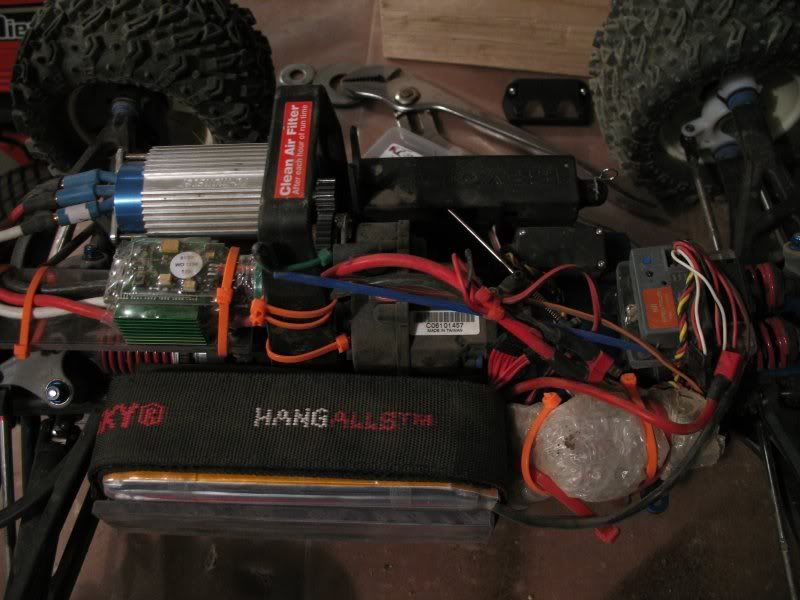 I have also made a few changes to the truck. Steering is now where is should be (I had more right then left?). The rear springs are now 33.7 lb/in fronts are 20.0 lb/in. The battery box is now mounted under the the AL tabs which both lowers the battery and helps to support the box during bad landings. I also took an idea from here to use a Home Depot Husky Hangalls strap for the battery. It works great and is cheap. But hard to find I had to order them off the website. After the 2 stores by me didn't have them. Add few more Ti things I had but hadn't put on.