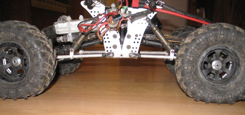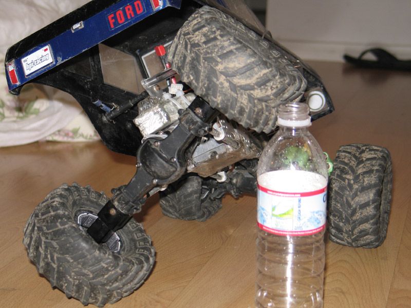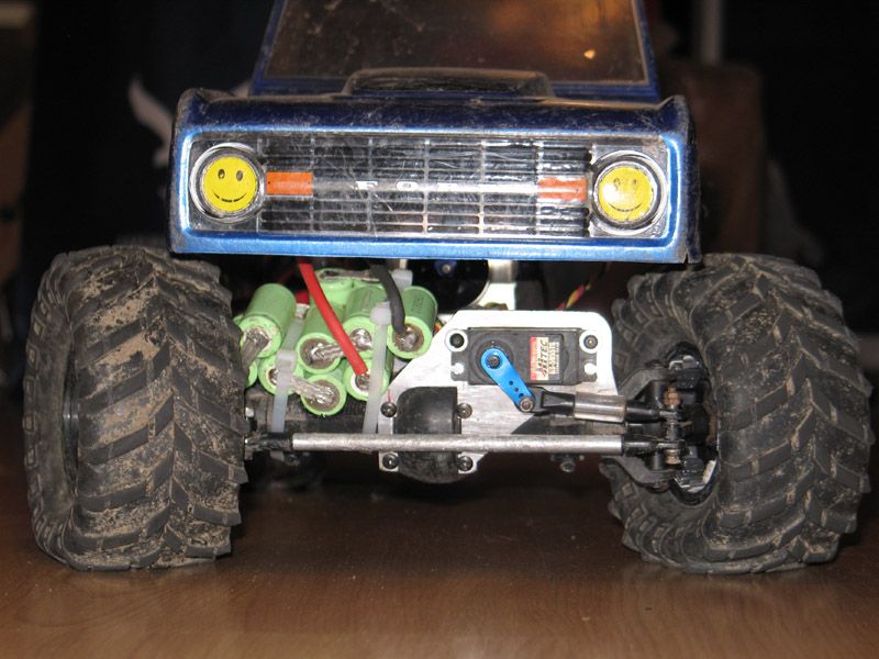 It could definitely have taken on the Wheelie King in the form seen in the pics. But now... It's totally different. For example, it's a droop setup, smaller/stiffer lower links, rotated lower link mounts, different gearing, soon-to-be 3s Lipo, custom (heavy) beadlocks, better-looking Bronco body, etc.