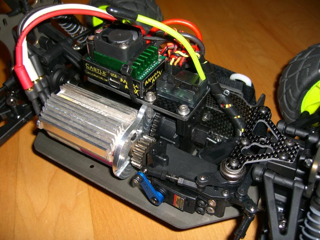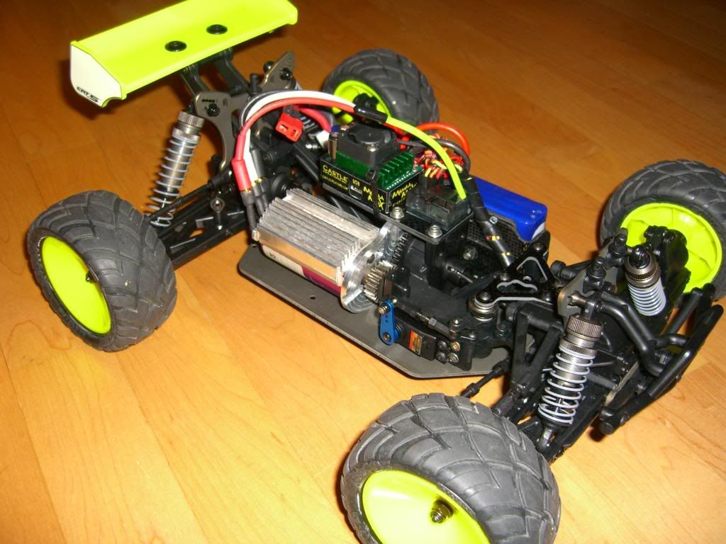 So far just a few laps around the living room. Seems like it has plenty of grunt. The Hacker 8L is probably a bit of overkill for this little beast, but I had it, so I'm using it. Its got Traxxas Bandit 2.2 Anaconda Tires on it right now because I am planning to take it out parking lot oval racing Friday night. Its geared 20/46 for around 45mph. Should be a handful at that speed being as little as it is. Final RTR weight is 4.2lbs with lipo. Overall I gotta say, I'm pretty impressed with the model so far. Seems really solid, makes 1/10 buggies feel like toys.